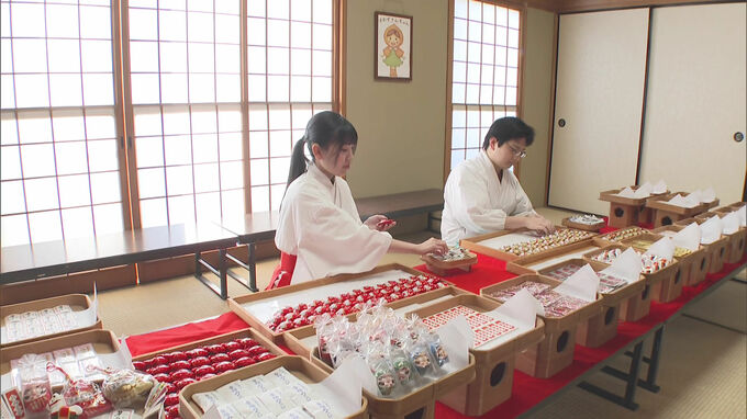 福岡市西区の愛宕神社では、神職と巫女の2人が「一年安鯛」と書かれた縁起物の鯛の容器におみくじを一つ一つ詰める作業を行っています。