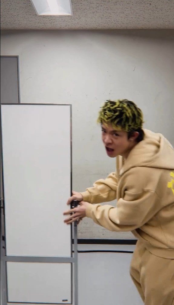 タオル、ペットボトル、姿見鏡、そして複数の大きなバッグを抱え、一瞬でフレームアウトするコミカルな動きを連発。