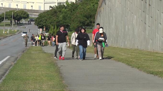 北谷町と米軍は、津波などの災害時に住民や観光客らが嘉手納基地の中を通って避難できる協定を2014年に結んでいて、参加者は20分ほ実際の経路を歩きながら、避難にかかる所要時間を体験していました。