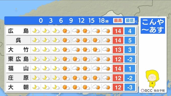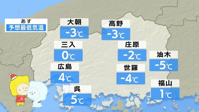 最低気温は、きょうと同じくらいの地点が多く、引き続き冷え込みが厳しい予想です。北部や内陸部ではほとんどの地点が氷点下となるでしょう。この時期らしい冷え込みが続くため、引き続き暖かくしてお休みください。