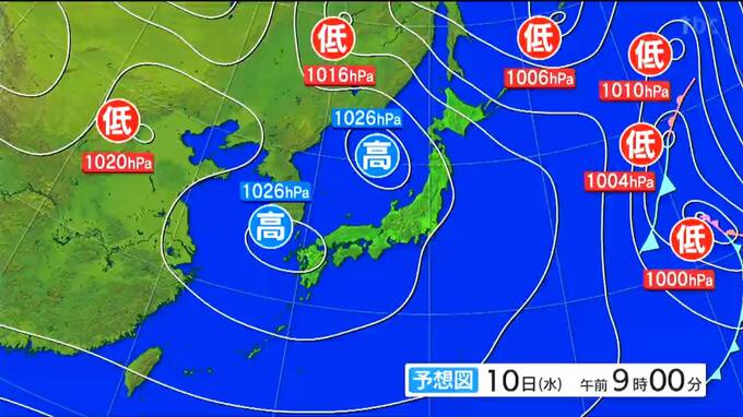 10日午前9時の予想天気図です。冬型の気圧配置が次第に緩むでしょう。広い範囲で移動性の高気圧に覆われる見込みです。