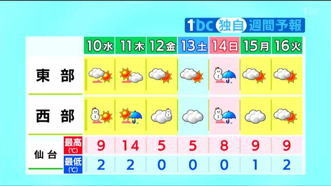 ■仙台:最高9℃最低2℃ ■白石:最高9℃最低0℃ ■石巻:最高8℃最低0℃