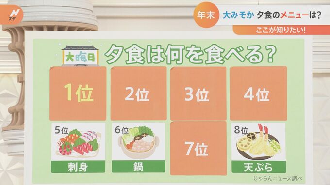 南波雅俊キャスター:20代から50代の男女1100人に聞いた大みそかの夕食何を食べますか?というアンケート調査(じゃらんニュース調べ)では1位 そば2位 寿司3位 決まっていない4位 すき焼き5位 刺身6位 鍋7位…