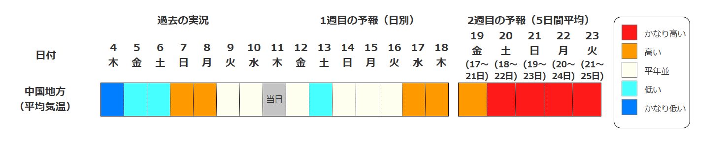 中国地方の気温は、向こう2日間程度は寒気の影響で平年並か低いですが、その後は寒気の影響を受けにくいため平年並か高く、18日頃からはかなり高くなる可能性があります。