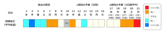 四国地方の向こう2週間の気温は、寒気の影響を受けにくいため平年並か高く、18日頃からはかなり高くなる可能性があります。農作物の管理等に注意してください。また、今後の気象情報等に留意してください。
