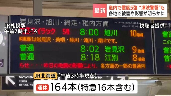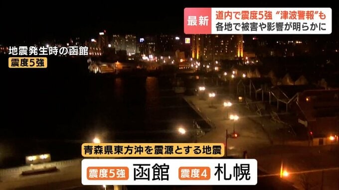 青森県東方沖を震源とする地震では、北海道函館市で震度5強、札幌市も震度4を観測しました。