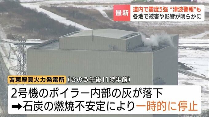 北海道電力によりますと、2号機のボイラー内部に付着した灰が地震の震動で下に落ち、石炭の燃焼が不安定になったことで一時的に停止したということです。