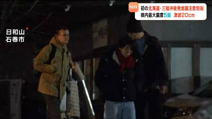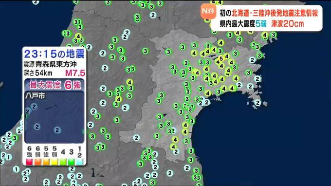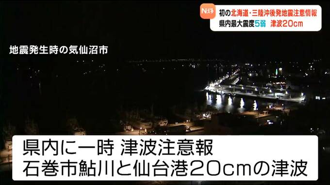 8日夜遅く、青森県東方沖を震源とする非常に強い地震があり、宮城県では最大震度が5弱で20センチの津波を観測しました。