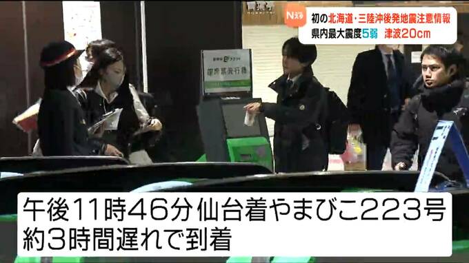 東北新幹線は、福島駅と新青森駅の間の下りで運転を見合わせ、午後11時46分仙台着のやまびこ223号は、約3時間遅れで到着しました。