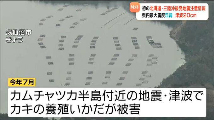 気仙沼市では、2025年7月のカムチャツカ半島付近を震源とする地震・津波でカキの養殖いかだが被害を受けました。