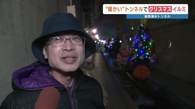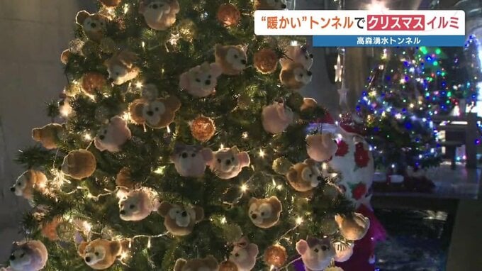 長さ約550mのトンネル内に飾られた高さ2mほどのクリスマスツリーは、企業や園児たちが作ったものです。
