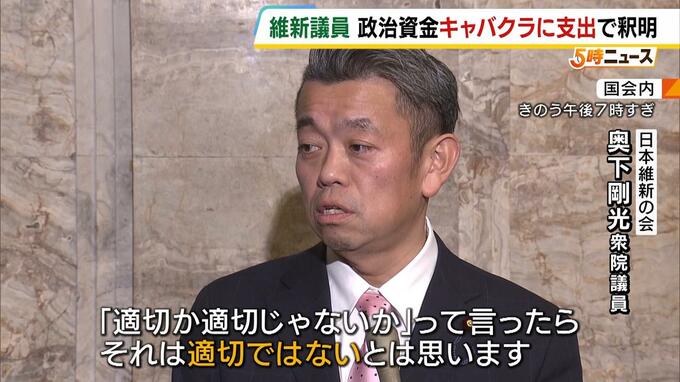 「身を切る改革」が旗印の維新所属の国会議員が、政治資金をキャバクラに支出し釈明です。 (日本維新の会 奥下剛光衆院議員)「『適切か適切じゃないか』って言ったら、それは適切ではないとは思います」 12…