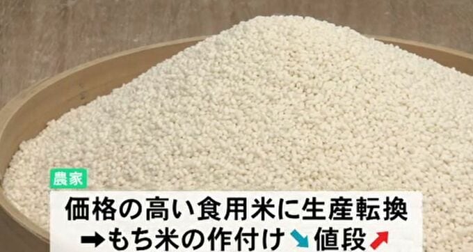 農家が価格が高い食用米に生産転換したためもち米の作付けが減り値段の上昇につながっているのです。