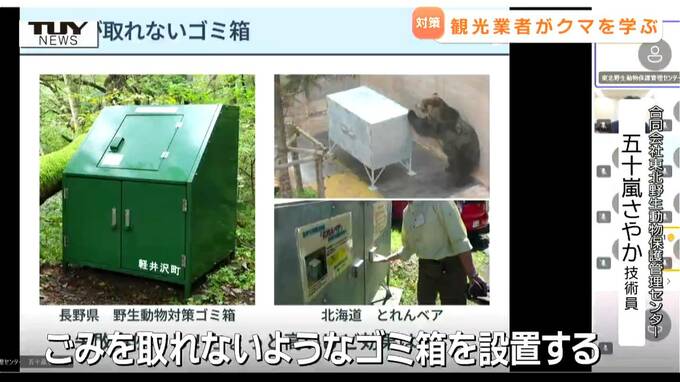 合同会社東北野生動物保護管理センター 五十嵐さやか 技術員「ここが一番大事になります。『えさ場として認識をさせないこと』。ごみを食べるようになったクマは人を襲うようになる場合もある。人身事故を起こす可能性が高くなる。ごみを取れないようなゴミ箱を設置する」