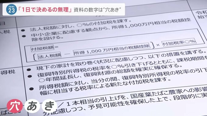 「いくら何でも重要な増税に繋がることを1日で、しかも数字が入ってない『〇年間』『〇%』で決めるというのは無理があるなと思います」