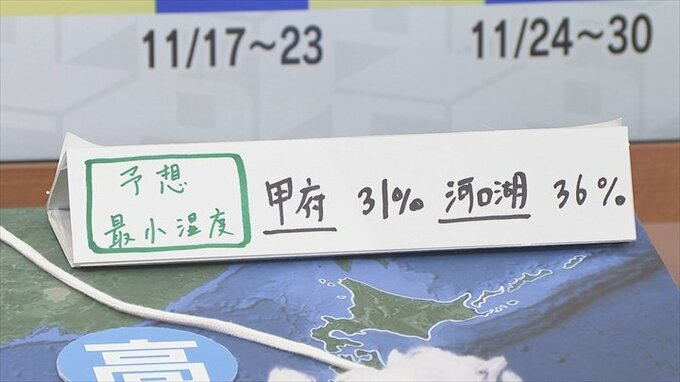 そして予想最小湿度を見ますと甲府が31%、そして河口湖が36%と空気の乾燥が続きますから対策をしっかりとお願いします。