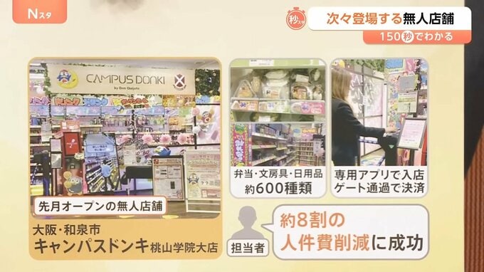 11月にオープンしたドン・キホーテの無人店舗「キャンパスドンキ 桃山学院大店」(大阪・和泉市)は、大学内にあります。学生の声を取り入れ、弁当・文房具・日用品など約600種類の商品が並んでいるということです。