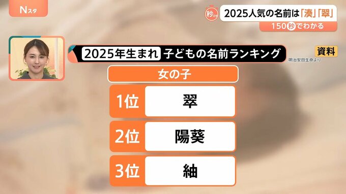 女の子は1位が翡翠の「スイ(翠)」で、2位に「ヒマリ(陽葵)」や「ヒナタ(陽葵)」。3位に「ツムギ(紬)」が入りました。
