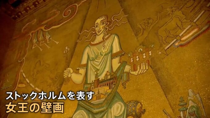 受賞者たちを迎えるのは、ストックホルムを表す女王の壁画です。