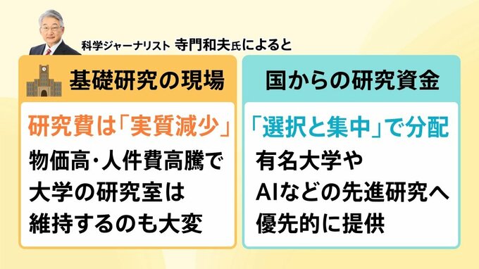 また、国からの研究資金は「選択と集中」で分配され、有名大学やAIなどの先進研究へ優先的に提供されているといいます。