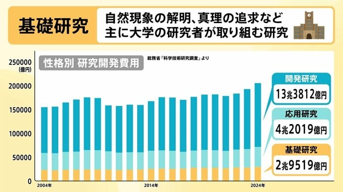 性格別の研究開発費用を見ると、2024年の▼基礎研究は2兆9519億円、▼応用研究は4兆2019億円、▼開発研究は13兆3812億円となっています。