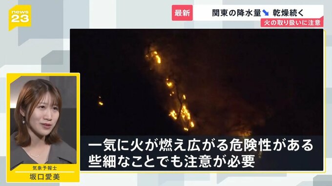 「乾燥注意報が出ている時は、気象庁が火災への注意を呼びかけている時。ちょっとした小さな火でも、ここまで空気が乾燥していると一気に火が燃え広がる危険性がある。些細なことでも注意が必要」