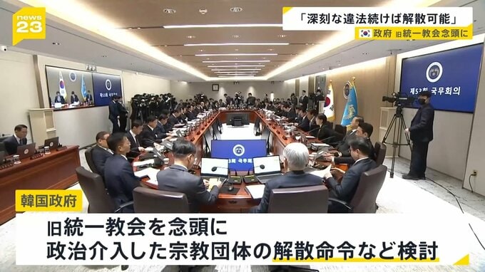 教団の本部がある韓国では、旧統一教会を念頭に政治介入した宗教団体の解散命令などを検討していて、韓国政府は9日、「組織的に深刻な違法行為が続く場合、解散が可能」との見解を示しました。