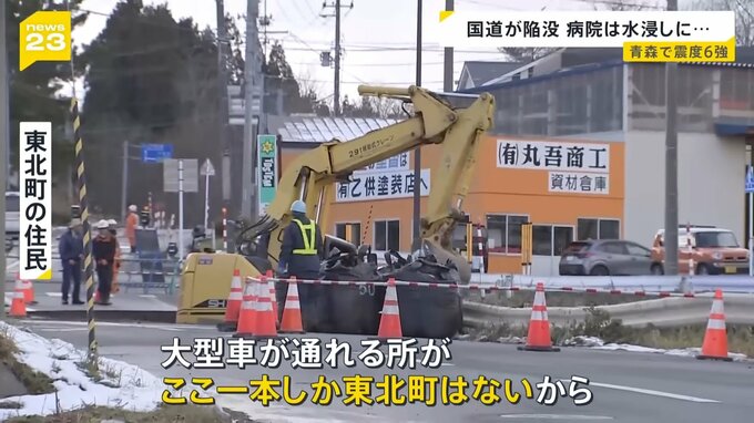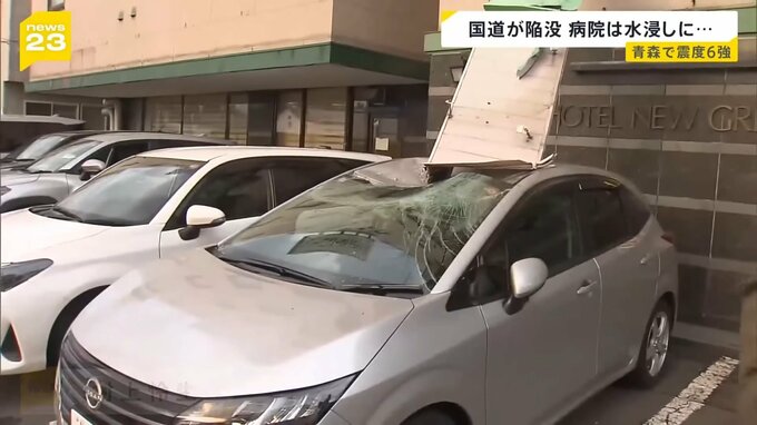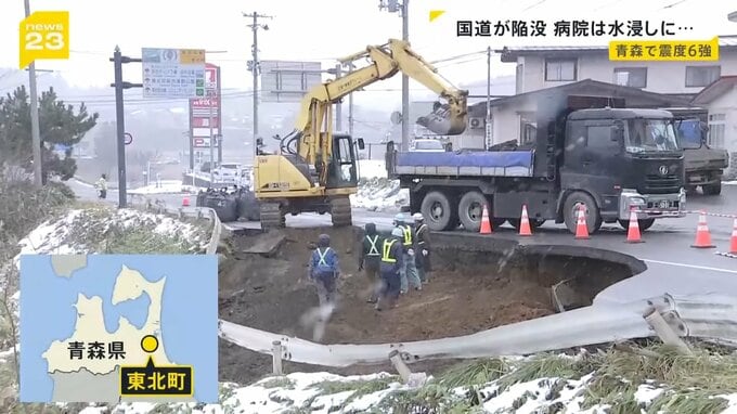 東北町では国道が陥没、作業員が復旧活動を行っています。ここに少し前まで残されていたのが、落下した乗用車。乗っていたのは50代から60代の男性で、病院に運ばれましたが意識はあったということです。