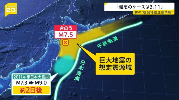 日本列島の太平洋沖の海底には、房総半島沖から北海道にかけて海側のプレートが陸側に沈み込む境目、千島海溝と日本海溝があります。この海溝沿いでは2011年、マグニチュード7.3の地震が起きた2日後にマグニチュード9.0の東日本大震災が発生。今回の地震をめぐっても同じように、今後1週間程度のうちに、さらに大きな地震が起きる可能性が平時より高まったと国は判断したのです。