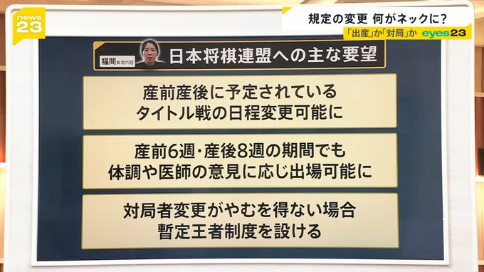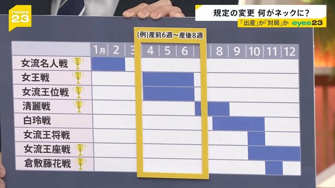 福間さんは6つタイトルを持っており、8つのタイトル戦がある中で、例えば産前・産後の期間が少しでも被ってしまうと「もう出られませんよ」というルールです。