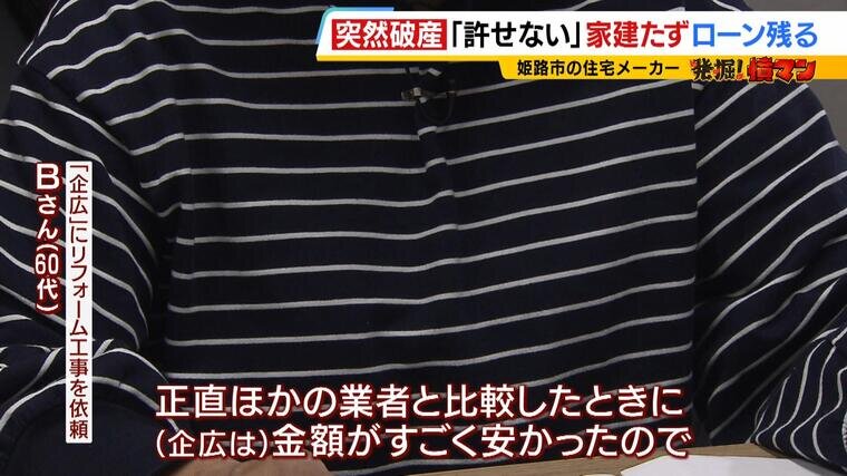 「企広」の破産で人生の歯車が狂ってしまった人は他にもいます。兵庫県内に住む60代のBさん。親が住んでいた実家をリフォームして住もうと考えていました。そこで去年7月、工事を依頼したのが「企広」でした。