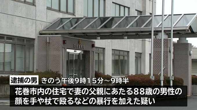 男は9日午後9時15分ごろから9時半ごろまでの間に、花巻市内の住宅で妻の父親にあたる88歳の男性の顔を手や杖で殴るなどの暴行を加えた疑いが持たれています。