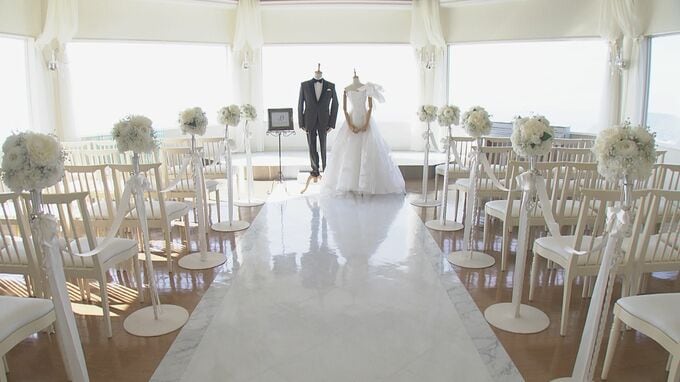 ホテル内の「海の教会」のほか、市のリーフレットで出てくる撮影スポットでも撮影可能。ドレス・タキシードが1着ずつで、美容着付・会場利用料などを含み、21万4500円です。依頼はコロナ禍前と比べて倍に増えていて、県外からのカップルも。