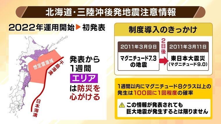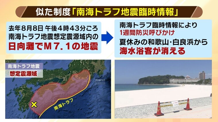 去年8月、日向灘でM7.1の地震が発生した際に「南海トラフ地震臨時情報」が初めて発表されましたが、その北海道・東北版だとイメージすればわかりやすいでしょう。当時は1週間防災が呼びかけられ、夏休みの和歌山・白良浜から海水浴客が消えるという事態となりました。