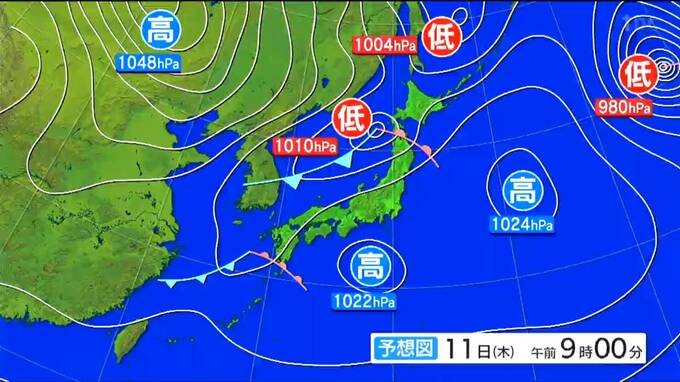 11日午前9時の予想天気図です。日本の南に中心を持つ高気圧に覆われる一方で、北日本を前線を伴った低気圧が通過するでしょう。