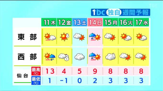 日中は暖かな空気が流れ込み、最高気温は10日より5℃前後高く11月中旬並みまで上がりそうです。