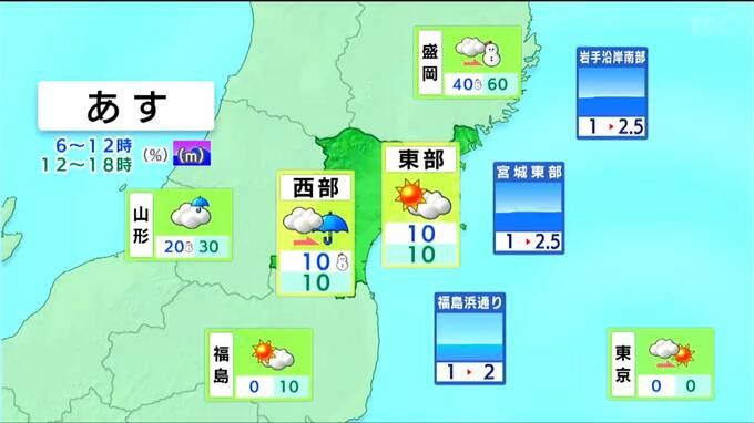 気圧の谷が東に抜けるため、東部・西部とも晴れてくるでしょう。内陸を中心に放射冷却が強まりそうです。