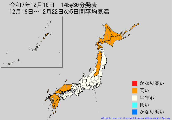 【2週間気温予報】北・東・西日本の気温は向こう6日間程度は平年並か低い日が多い予報 その後は平年並か高い見込み 全国の天気を画像で 気象庁 テレビユー山形 2025年12月10日(水) 15:56 国内 ■12月18日~12月22日の5日間平均気温 ・8日先から12日先まで5日間平均した日平均気温を表示しています。 ・かなり高い(かなり低い)は、かなり高い(かなり低い)気温となる確率が30%以上のときに表示します。