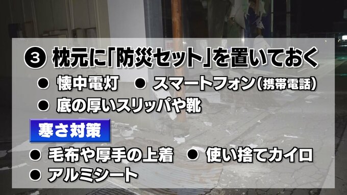 そして、手の届く範囲、「枕元などに防災セットを置いておく」こともおすすめします。まずは、懐中電灯やスマートフォン、携帯電話はもちろんのこと、この時期は寒さ対策として毛布や厚手の上着、使い捨てカイロや防寒用のアルミシートも防災用の持ち出し袋に入れておくことをおすすめします。冬の避難の場合、低体温症のリスクもあるため、寒さ対策は重要です。