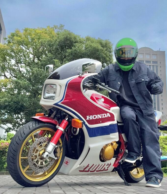 そして、レイザーラモンRGさんの「緑色のヘルメット」も印象的です。愛車と佇む姿からは、バイク愛好家としての一面が垣間見えます。背景には緑豊かな木々と高層ビルが広がり、都会のオアシスのような場所での撮影となっています。