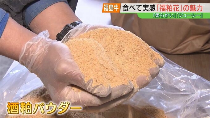 一番の特徴は日本酒どころ・福島の酒粕から作ったパウダーをエサとして与えている点です。出荷前の90日間、1日100グラムずつ、酒粕パウダーを与えています。そして、肉質が最高級の5等級のものだけが福粕花を名乗ることができます。