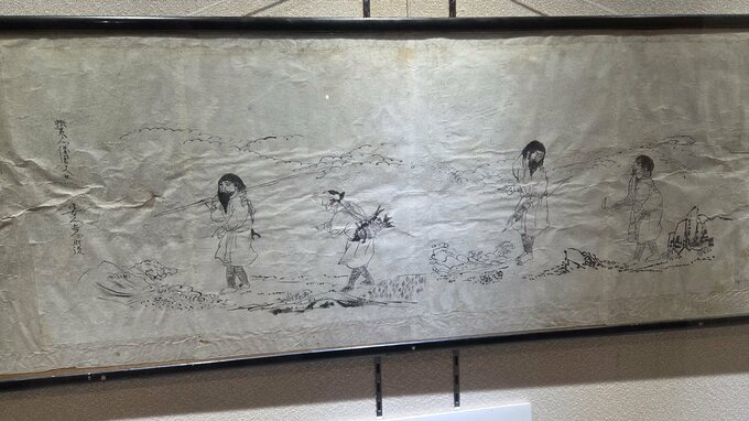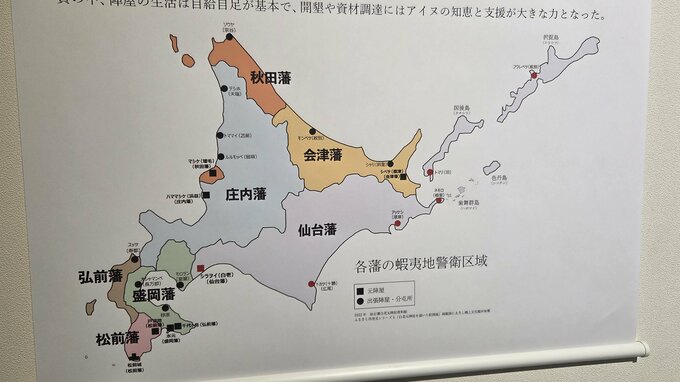会場には白老元陣屋内の建物の配置を示した「蝦夷白老仙台陣屋図」や、蝦夷地警衛の勤番にあたった岩谷堂の足軽が現地のアイヌの人たちを描いた「蝦夷人像」などが展示されています。