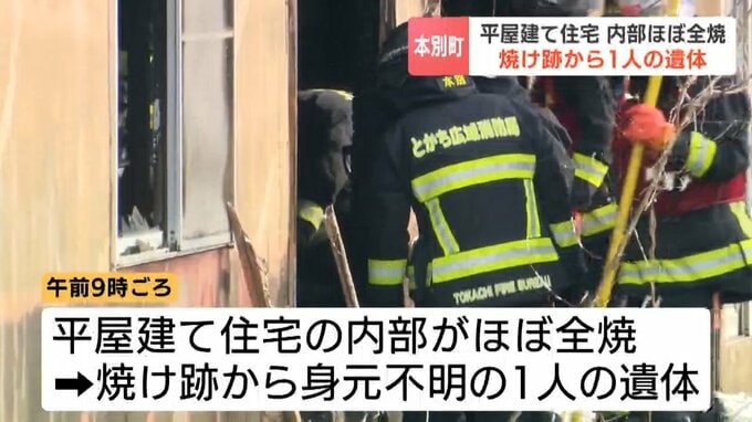 10日午前、北海道十勝地方の本別町で、平屋建て住宅の内部がほぼ全焼し、焼け跡から年齢と性別の分からない1人の遺体が見つかりました。
