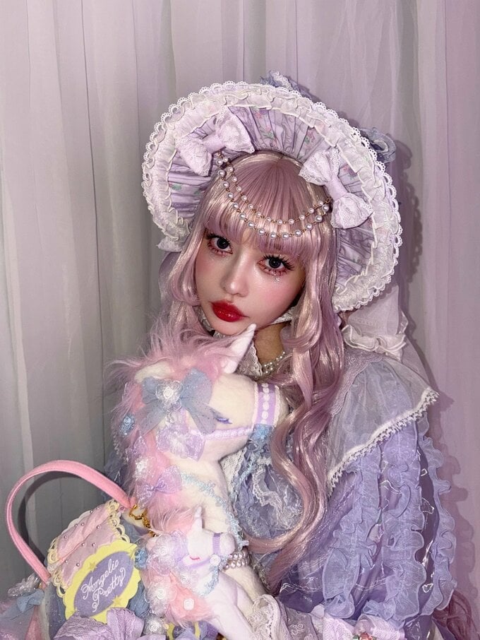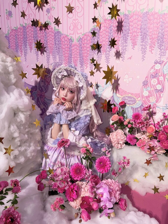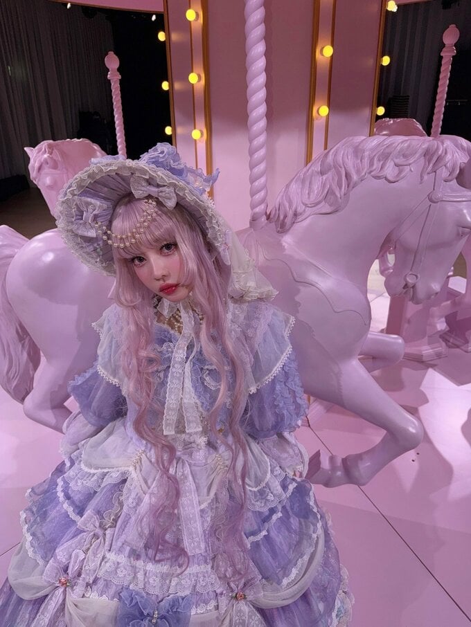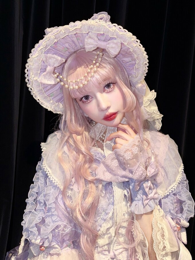 中村さんが身にまとった衣装は、パステルカラーを基調としたロリータファッション。薄紫(ラベンダー)と水色を中心に、白やピンクを組み合わせた優しい色使いが特徴的です。