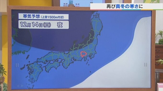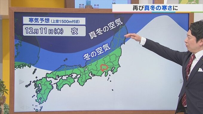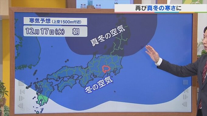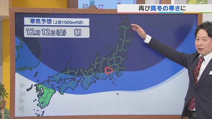 上空の冷たい空気=寒気の予想で見ていきますと、あすの夜にはもう冬の空気がだんだん南へ下がってきている状況で、その後金曜日頃になるとこの真冬並みの寒さの空気がだんだん南下してくる予想となっています。