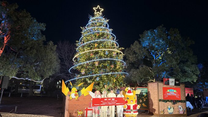 きょうから始まる「Pokémon Happy Holidays」ブースでピカチュウと共にツリーの点灯式に参加した4人。