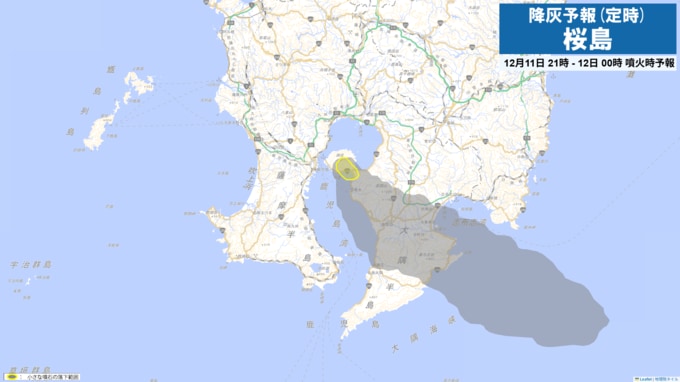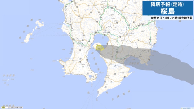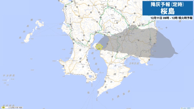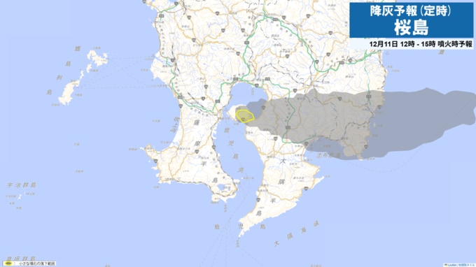 11日09時から12時までは火口から東方向、11日21時から24時までは火口から南東方向に降灰が予想されます。 11日9時から12日3時までに噴火が発生した場合には、以下の方向・距離に降灰及び小さな噴石の落下が予想されます。