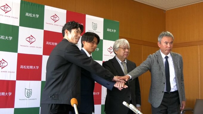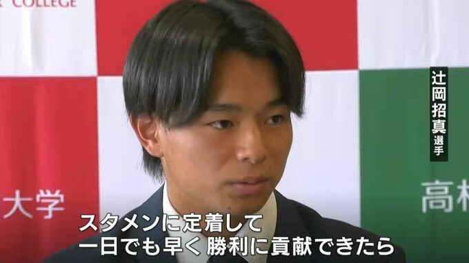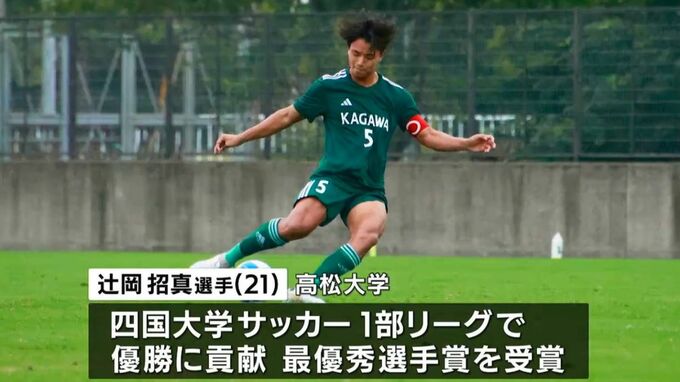 辻岡招真選手は、高松市出身の21歳で、4歳でサッカーをはじめ、尽誠学園高校から高松大学に進みました。大学では、ディフェンダーとして1年生から活躍し、今年は四国大学サッカーの1部リーグで優勝に貢献。最優秀選手賞を受賞しています。