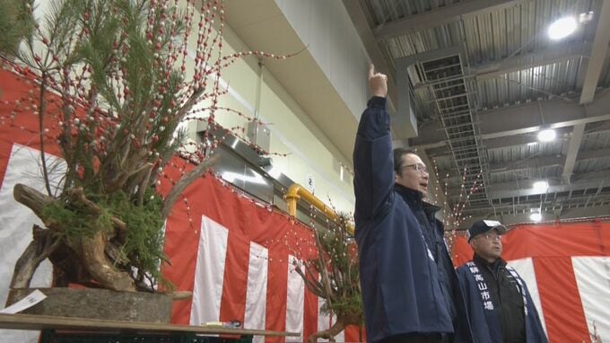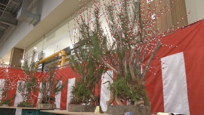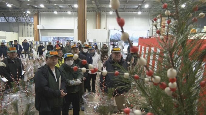 花もちは、木の枝に紅白の餅を巻き付け花に見立てた飛騨地方の正月飾りです。けさは花もち480株が並び、高いものは6万円で競り落とされました。
