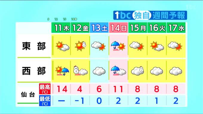 12日の最高気温は仙台で4℃までしか上がらない予想です。これに雪と風も加わりますので、かなりの厳しい寒さとなります。防寒対策を万全にしてお過ごしください。11日夜遅くから明日にかけて西部を中心に本格的な雪となりそうです。今後の情報にご注意ください。